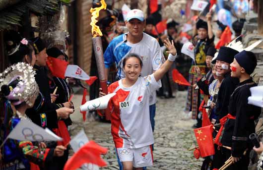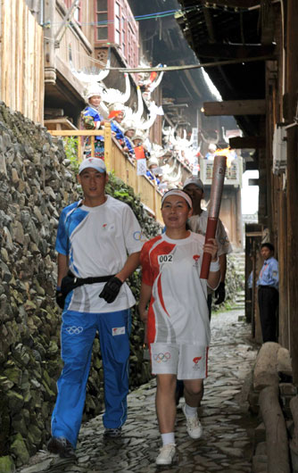 第一棒火炬手在传递第2棒火炬手在苗寨传递