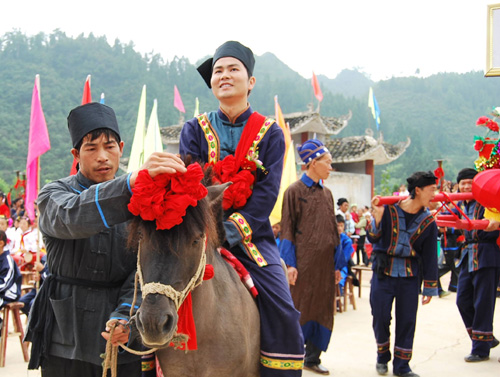 9月7日,在贵州镇远县尚寨乡举行的唢呐节活动现场,参加土家族婚俗表演的土家族青年骑马接亲。