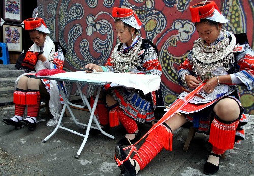 9月26日,少数民族姑娘在展示刺绣、蜡染和纺织技艺。