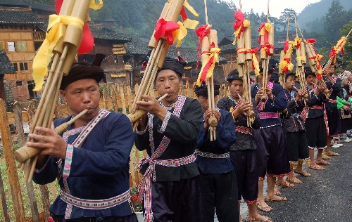 9月26日,西江“千户苗寨”的苗族同胞在村头吹奏芦笙迎接参加盛会的客人。