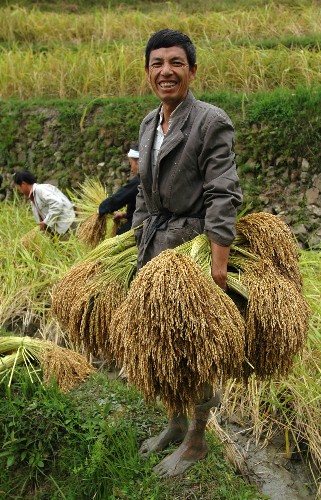 10月13日,贵州从江县高增乡的侗族农民抱着丰收的香禾糯笑逐颜开。