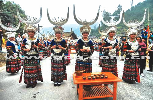 10月29日,苗族姑娘在西江苗寨大门口设拦门酒迎接游客。贵州省雷山县西江千户苗寨以其独特苗家风情吸引着大量外地游客,时令即将进入冬季,但西江旅游仍持续火爆。