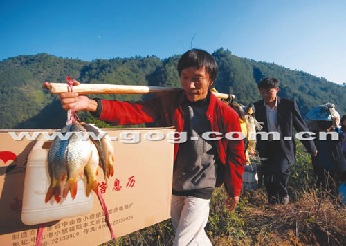 11月8日至19日,凯里市三棵树镇大乌烧村苗族同胞举行13年一次的“牯藏节”,当地家家亲友、客人汇聚,举行11天的隆重祭祀和芦笙舞等活动。图为11月8日,苗族同胞挑着礼物到凯里市三棵树镇大乌烧村参加“牯藏节”。