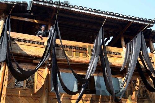 在贵州省从江县谷坪乡银潭村,侗家妇女趁着好天气在门前晾晒“亮布”。侗族服装使用的“亮布”是一种经过染色的粗布料。这种布料的制作要经过浸染、捶布、晾布和涂抹鸡蛋清等多道工序,工艺古朴,别具民族特色。