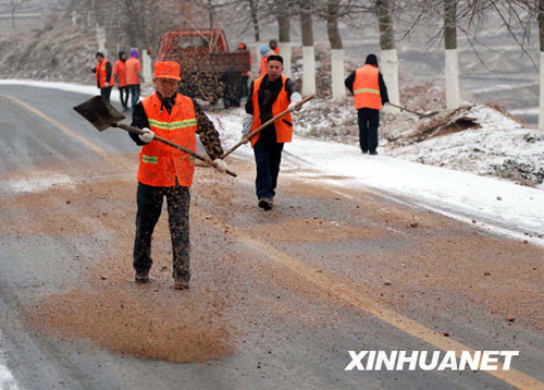 1月7日,路政人员在凯里市境内的320国道凝冻路面上撒防滑沙。