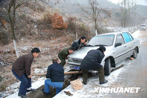 1月7日,在凯里市境内的320国道上,路政工作人员和群众合力救助一辆滑入边沟的车辆。