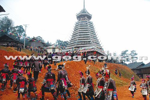 侗族鼓楼是侗族村寨的标志性建筑物,为木质结构,以榫穿合,整座建筑不用一枚铁钉。以七八层居多,呈四面、六面或八面形,一般高十多米,最高者达数十米,形似宝塔,飞阁重檐,结构严谨,做工精巧。是侗族同胞娱乐、休闲、演艺、唱歌、集会的公共场所。图为侗族同胞身着节日盛装赶来参加鼓楼落成典礼。