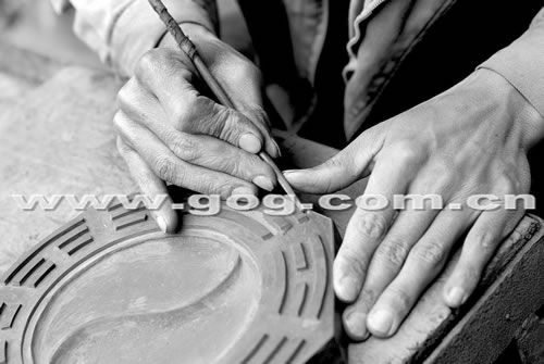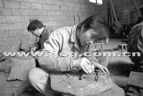 图为3月31日,一名制砚工人在雕凿思州石砚。