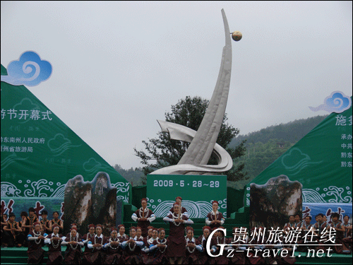 随着贵州省政协主席黄瑶同志宣布“‘多彩贵州’首届贵州民族体育旅游节暨2009中国·贵州施秉第七届杉木河漂流节开幕”,一场精彩纷呈的民族民间艺术表演拉开了帷幕。虽然当天天空中飘着细雨,但会场边仍聚集了许多前来观看开幕式表演的群众。
