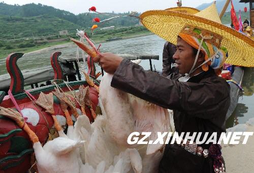 2009617,苗族群众将鸭子送给本村寨的独木龙舟组,为独木龙舟竞赛鼓劲加油。当日是农历五月二十五,在贵州省台江县施洞镇清水江畔,来自施洞镇周边数十个苗族村寨的众多苗族同胞欢聚一堂,开展龙舟竞渡,欢度当地的传统节日独木龙舟节。独木龙舟节每年农历五月二十五开始,持续3天。