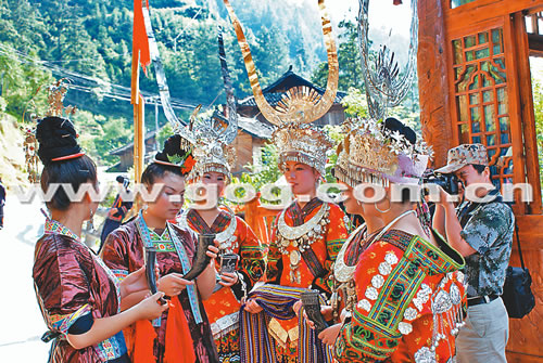 自贵州省第三届旅游发展大会在雷山县西江千户苗寨成功举办后,有力助推了西江苗寨旅游产业快速发展,成为了村民增收致富的引擎。据介绍,今年1至5月份,西江景区接待中外游客达33.2万人次,实现旅游综合收入6100多万元。图为西江苗寨少女正乔妆打扮迎接游客的情景。