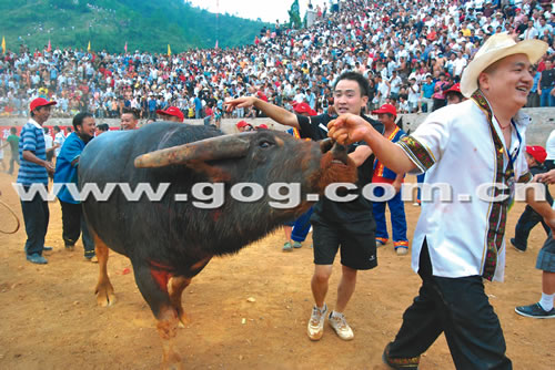 最扣人心弦的重量级冠军争夺战在24日举行。比赛中,战局风云变幻,战前被看好的云南“牛王”和凯里“大力士”意外出局,毫无战绩,而此前不起眼的铜仁“黑牛”则一路过关斩将,最终打败来自凯里三棵树镇的15号斗牛夺取桂冠。