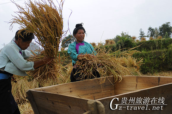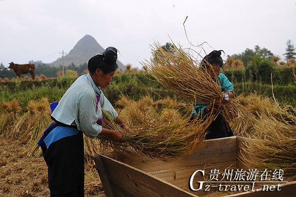 2009年9月12日,贵州省丹寨县龙泉镇卡拉村苗寨同胞正利用艳阳天收割已成熟的稻谷。