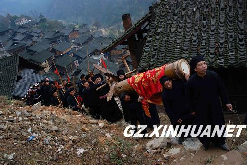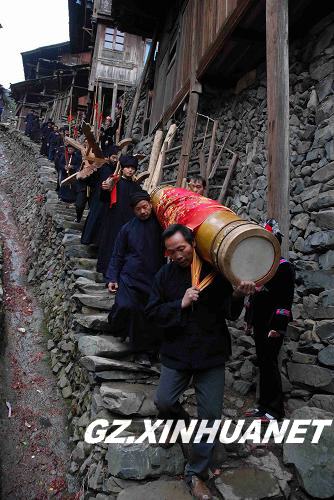 2009年12月2日,苗族鼓藏队抬着木鼓在贵州省雷山县郎德镇乌流村窜寨。