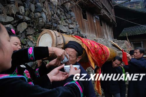 2009年12月2日,贵州省雷山县郎德镇乌流村的苗族女子为窜寨的鼓藏队员敬酒。