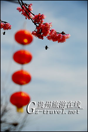 火红的灯笼与盛开的樱花构成了一幅新春的画卷