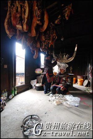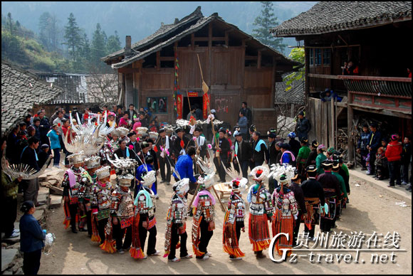 排调镇羊巫村的苗族女孩子在穿戴盛装准备到芦笙堂上跳芦笙舞