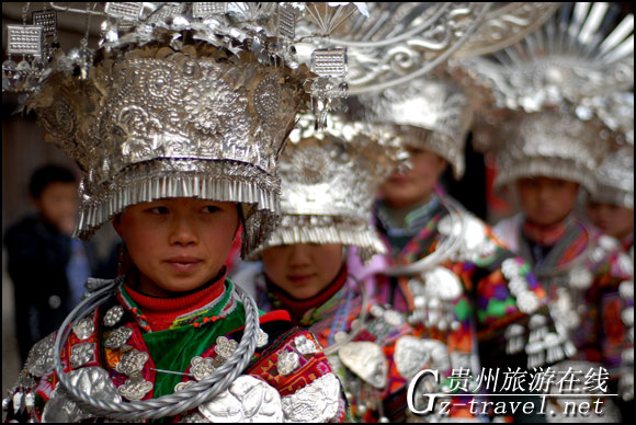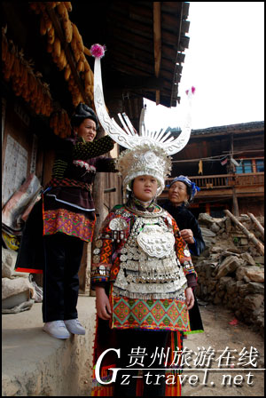 排调镇羊巫村的苗族女孩子在穿戴盛装准备到芦笙堂上跳芦笙舞