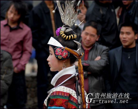 一名苗族女孩子身着盛装跳芦笙舞
