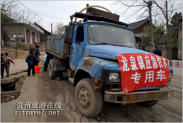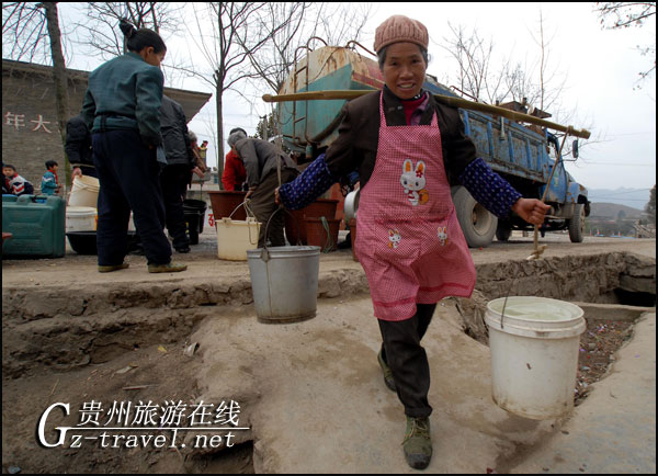 3月5日丹寨县龙泉镇羊甲村苗族村民在排队接取镇政府送来的饮用水