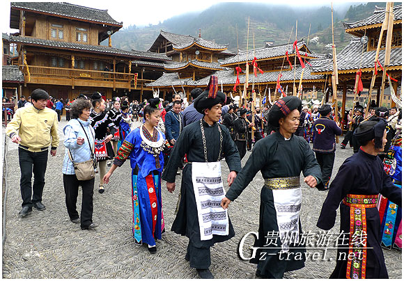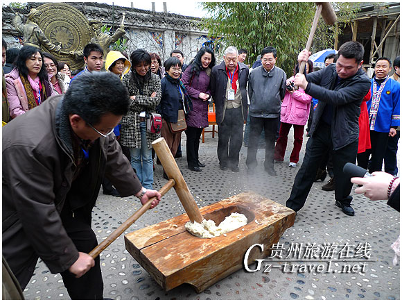 晚餐在凯里亮欢寨,感受苗家“打糍粑”,台湾旅行业品质保障协会理事长林进荣还亲自上前尝试了打糍粑的乐趣。