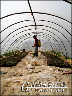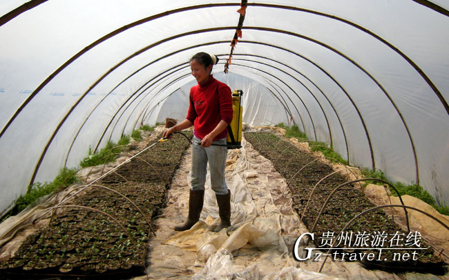 2010年3月9日贵州省丹寨县兴仁镇城江村的苗族妇女王金花在大棚里给西瓜苗施营养液