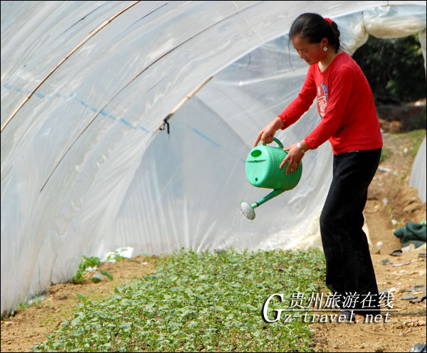 2010年4月8日,贵州丹寨县兴仁镇白头村的西瓜种植户王家梅在西瓜大棚里给秧苗浇水。