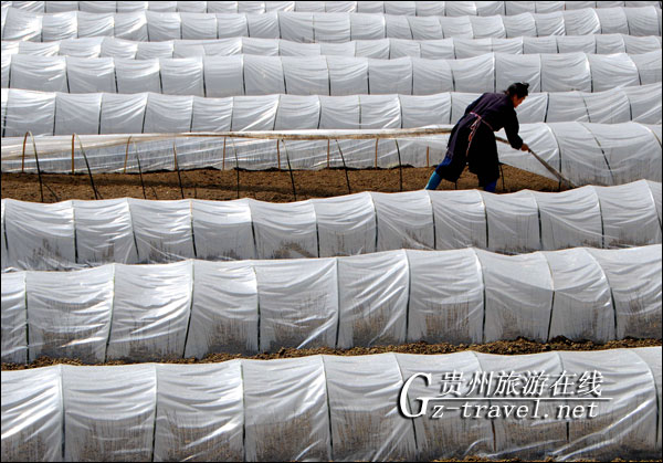 2010年4月8日,一名丹寨县龙泉镇马寨村的苗族村民在覆盖农膜的育秧地里整理农膜。
