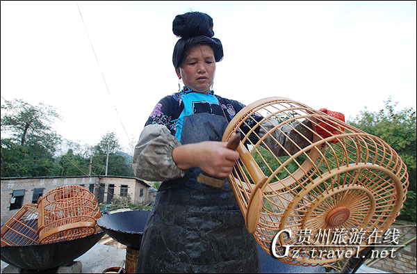 贵州省丹寨县卡拉村,一名苗族妇女在凉晒上好漆的鸟笼