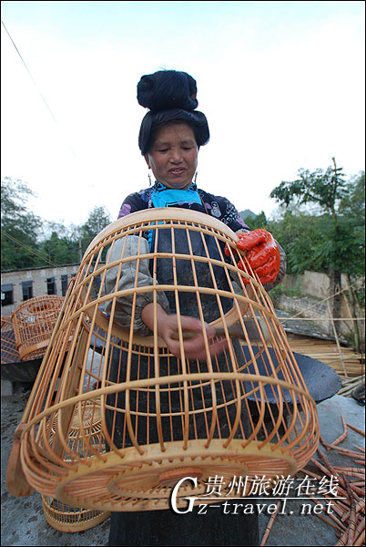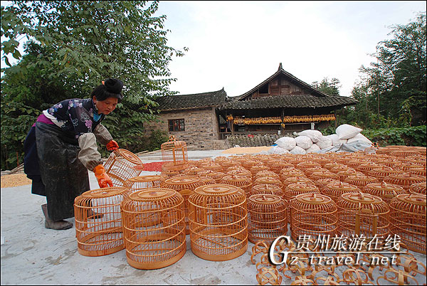 贵州省丹寨县卡拉村,一名苗族妇女在凉晒上好漆的鸟笼