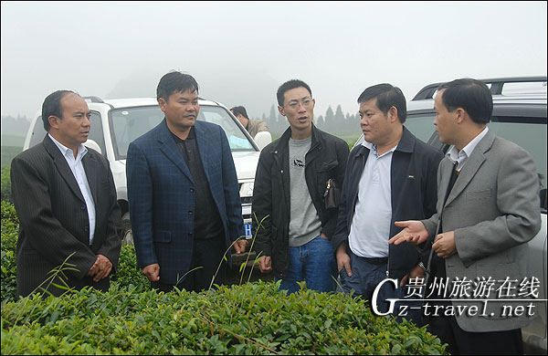 丹寨县政协副主席张正文(左一)陪同“国品黔茶”经营有限公司总经理汪建(右二)一行在丹寨县金钟茶叶种植基地考察