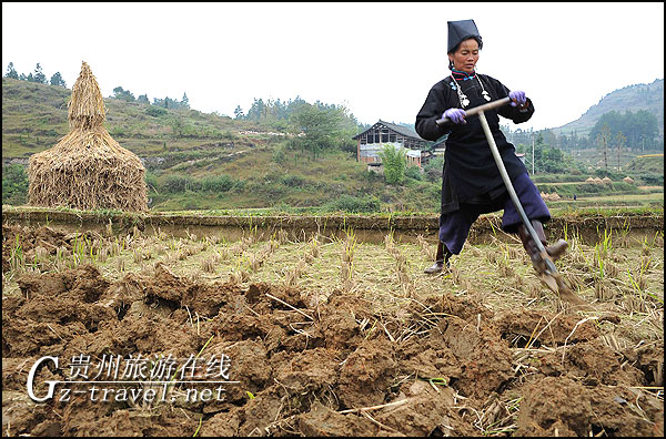 贵州省黔东南苗族侗族自治州丹寨县扬武乡羊排村,一名苗族妇女正在用传统生产工具翻地