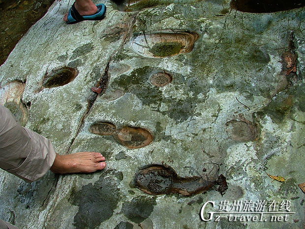 在贵州省榕江县平阳乡小丹江村两公里处,有一件让人匪夷所思的事情,至今没有人知道为什么会这样,就是在当地的“四迭瀑布群”附近,发现了许多和人的脚印相似的“神秘印迹”。