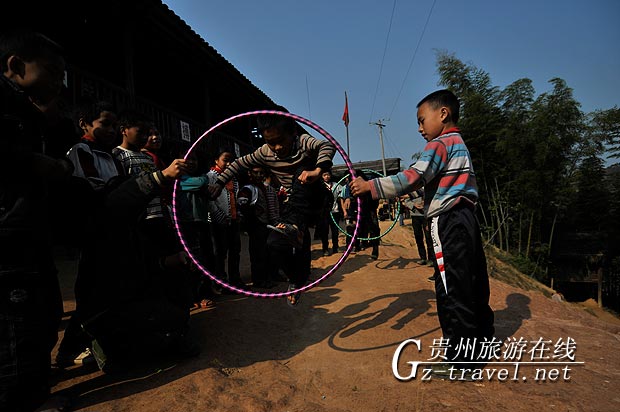 城里普遍的呼啦圈,在这里成了山区小朋友最新鲜的玩具,一名小男孩正在向大家表演刚学会的玩具