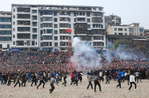 “抢花炮”有着“东方橄榄球”的美称,是一项争抢十分激烈的民间体育运动,已列入全国民族体育运动项目。 “抢花炮”在贵州省从江县远源流长,每年农历正月二十八日举行,“抢花炮”有这么一个传说。相传侗族先祖在山上劳作时,天上突然“轰隆”一声巨响,一个美丽的彩色圆环落在了老人的面前,老人便把它捡回寨子,这一年,寨子风调雨顺,六畜兴旺,五谷丰登,而且有人高中皇榜。从此以后,每逢这个时节,老人就做一个五色彩环的吉祥物,用铁炮送上天空,让聚会的各族青年争抢,以示吉祥。久而久之便形成了今天的“抢花炮”。这一天,从江的各族儿女就像过年一样,身着民族盛装,穿戴一新,纷纷涌到花炮比赛场地观看抢花炮活动。从江“抢花炮”共抢三炮,“金龙一炮”象征官运,“玉龙二炮”象征财运,“银龙三炮”象征鸿运。“抢花炮”就是抢吉祥,看花炮就是迎接吉祥的到来,因而抢得花炮的运动队,欢天喜地,欣喜万分,回到家后,三亲六戚,亲朋好友都燃着鞭炮前来祝贺,真可谓一人夺炮,全寨吉利。