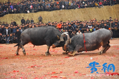 据悉 2月20日,从江县丙妹镇“孔明斗牛堂”举办了该县有史以来规模最大的一次斗牛活动,一共有30头牛参加了比赛,附近上万名村民赶来观看斗牛比赛,场面非常刺激和壮观。