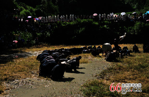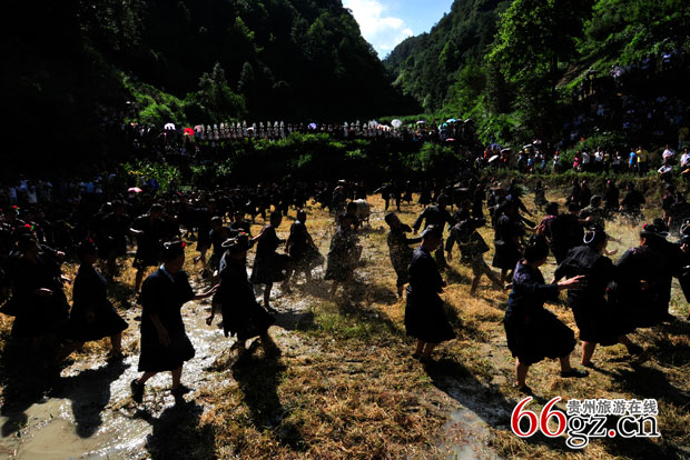 7月12日,贵州省黔东南剑河县仰阿莎文化节开幕,下午3点,喝过拦门酒后到达一个原始树林包围着的农田边。四周围满了游客,很多当地苗族中年男女身着自己做的黑色衣裙,在寨老的主持下,大家跪在田里,两手握着,朝天拜地,完成仪式后,鼓声敲响,苗族男女在稀田浑水里翩翩起舞,原生态的水鼓舞一瞬间成为山头田边数千双游客目光的焦点。