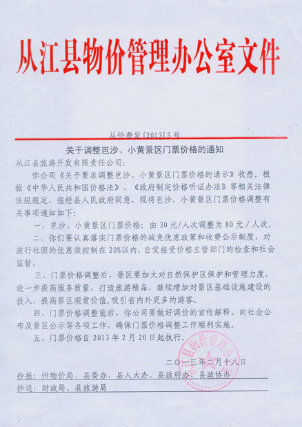 从江县物价管理办公室《关于调整岜沙、小黄景区门票价格的通知》(从价费发〔2013〕3号)