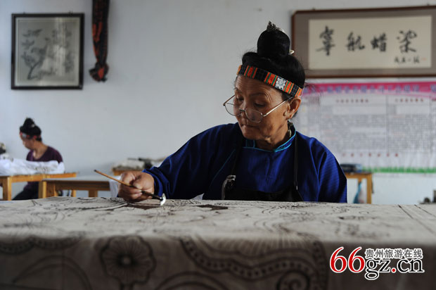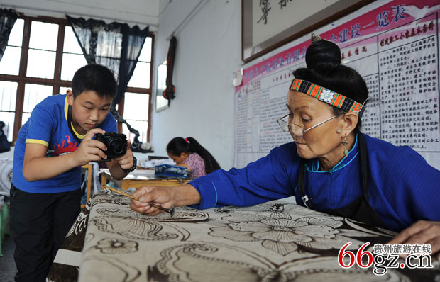 贵州省丹寨县宁航蜡染厂,一名游客在拍摄蜡染画工的画蜡技艺