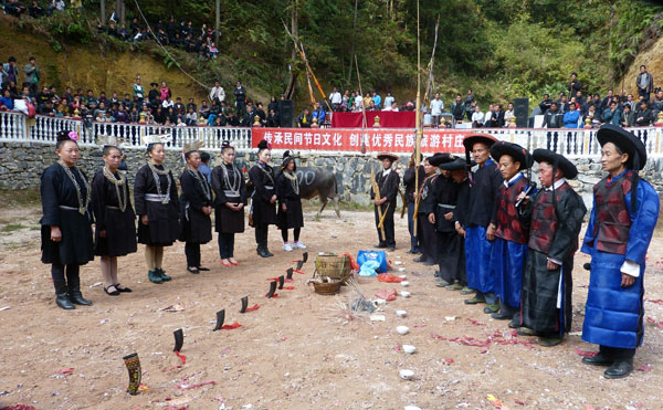 反排苗年节是在农历的十月里按传统选择日子,祭祖节——是反排村人民十三年一度的一个盛典节日,苗语称“nongx jangd niel”,音译“浓将略”,意译“吃牯藏”。反排祭祖节仪式比较复杂,十三年一次,历时十四天。