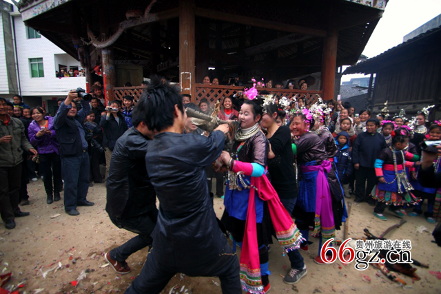 至此之后,如果姑家的女儿不愿嫁到舅家,便可依据老规矩,由姑娘的父母出面,抬出家里最好的米酒,摆上糯米磁粑,把娘舅两寨的“嘎佬”(最受尊敬的长老)请来做仲裁人,于农历正月初二,在女方寨子的鼓楼前坪地上摆开阵势,中午时分,礼炮三响,抢鸡便在鞭炮声中开始,姑娘将一头倒捆着公鸡,一头挂有饭囿(一种竹制的盛饭用具)的长扁担在肩上,公鸡在身前,饭囿在身后,女伴们在其后用手护着长扁担,姑娘则用鸡挑逗前来抢鸡的表兄和其他想娶她的男青年一块来抢。