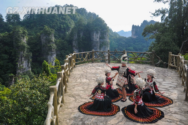 几位苗族少女身着盛装在云台山上跳起民族舞蹈。新华社记者 刘续 摄