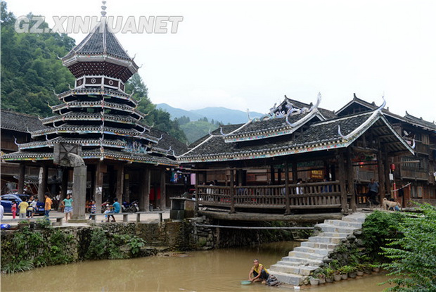 这是7月3日在贵州省黎平县肇兴侗寨拍摄的仁团鼓楼和风雨桥。马宁 摄