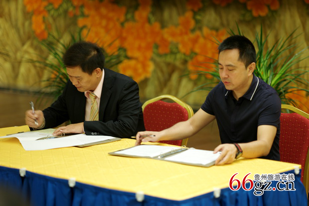 雷山大酒店总经理王汉辉与中国国旅(贵州)国际旅行社总经理吴比签订合作协议。