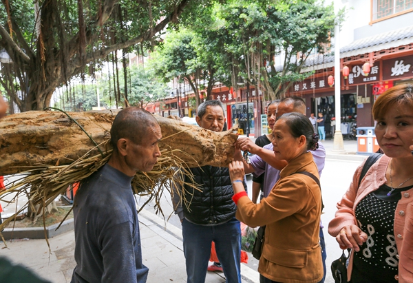 10月31日,榕江县古州镇高董寨苗族村民龙老望扛着一根硕大的鬼葛根进县城出售,吸引市民们纷纷围观。