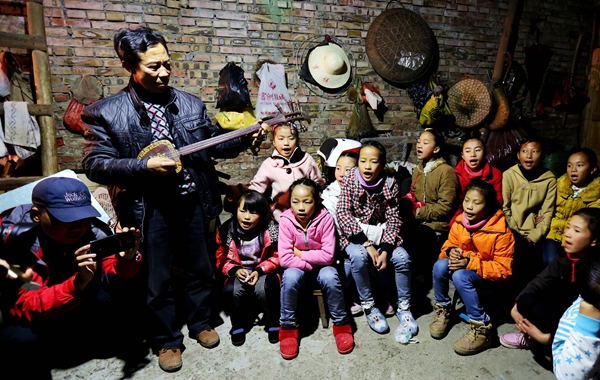 2014年11月7日晚,榕江县栽麻乡大利小学教师、歌师、戏师石文昌(左一)在给少年歌队教唱侗族琵琶歌。(徐基茂 摄)