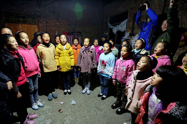 2014年11月7日晚,榕江县栽麻乡大利侗寨少年歌队正在练唱侗族蝉歌。(李长华 摄)
