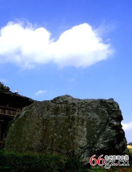 更为惊奇的是,这个二十来户的苗寨还有10多个巨大石头“相伴”,且全部是由一块组成,属于单体巨石。其中最小至少300吨重,最大达400多吨。这些巨石往往安插在两栋木房中间,远看像一座“小山”,恰好成为了这里苗家的天然“墙壁”,这实属罕见。经观察,10多块巨石表面不规则,多呈暗灰色。由于石头大,附近农户多用其来当“晒场”。