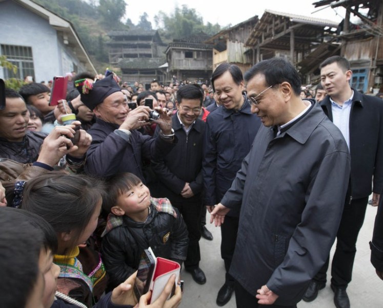 据人民网报道,2月13日下午,当李克强总理来到贵州黎平县国家级一类贫困的蒲洞村时,一名小男孩拿手机一路追拍李克强。报道称,小男孩身高看上去只有1.1米左右,他不时会被人群挤“没”,但每次都能顽强地从人缝中再钻出来,抢占最佳位置,一通猛拍。新华社记者黄敬文摄