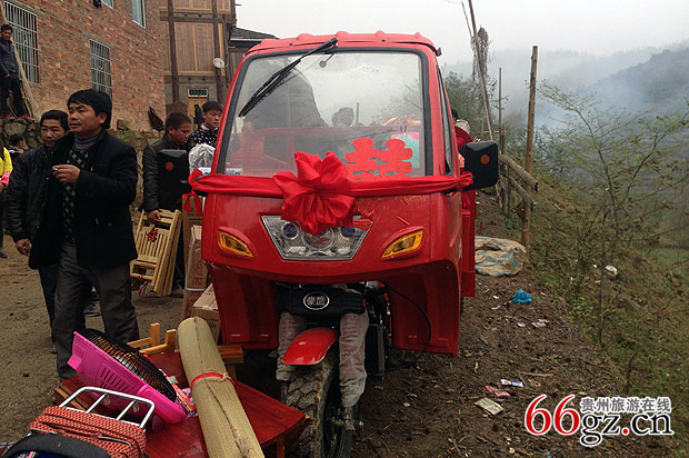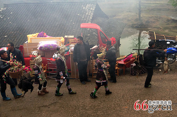 亲戚们把鸡鸭鱼挑来送给新娘家